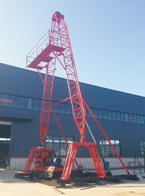 AY-13型鉆塔可配套各種水井鉆機(jī)和XY系列巖芯鉆機(jī)直、斜孔的施工。其特點(diǎn)為設(shè)計(jì)除具有承載能力較大、結(jié)構(gòu)合理、液壓起塔安全,拆裝、搬運(yùn)成本低等特點(diǎn)外,顯著特點(diǎn)是一是塔腳跨度大(5米),操作鉆機(jī)空間大;二是塔身下塔腿鏈接鉸鏈高于底座底梁2.3米,從而在鉆機(jī)左右擺放時(shí)下塔腿不影響鉆機(jī)前后移車,鉆機(jī)動(dòng)力部分可移至塔腿支撐內(nèi)檔中。也使得斜孔鉆進(jìn)和提鉆過程中天車、回轉(zhuǎn)、井孔達(dá)到三點(diǎn)一線,大大提高了定向井孔施工的安全性。